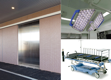 軽量で安全性の高いLED救急専用無影灯、ベッドサイドで情報が一元管理できるシーリングペンダント、救急用に開発された専用ベッドなど、最新機器を導入、また2階エリアへの専用エレベーターも配備し、より高度な救急治療にも対応しています。