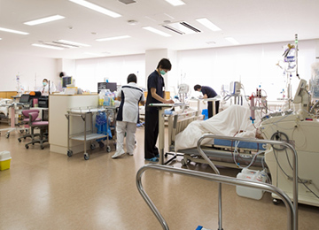 当院に入院中されている患者さんの人工透析を行っています。クリニックなどの外来透析とは異なり、重症患者さんが多いため、透析全般の知識に加え、急変時の対応や各疾患の病理を理解し、質の高い透析を提供できるよう努めています。