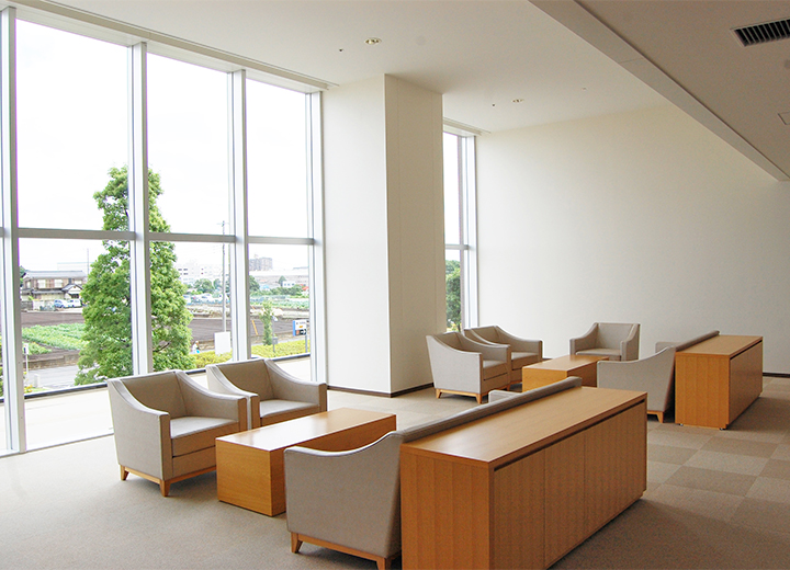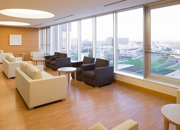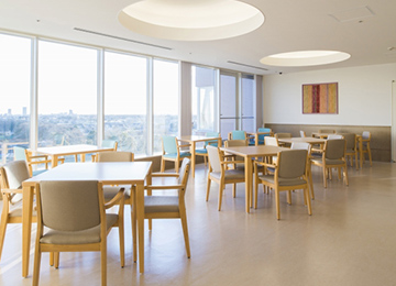 入院生活のストレスを軽減し、より快適にお過ごしいただけるよう、明るく開放感あふれるデイルームを各フロアにご用意しました。自然光をたっぷり取り込む大きな窓からは、緑あふれる和名ヶ谷の街並が臨めます。