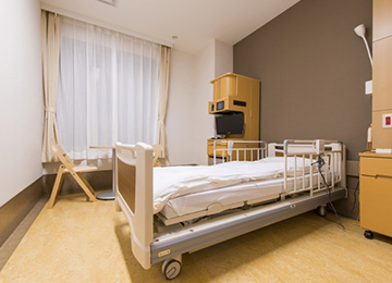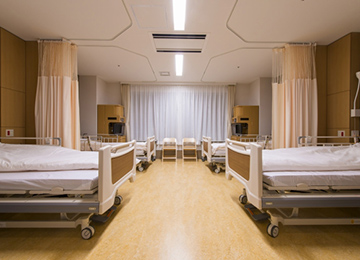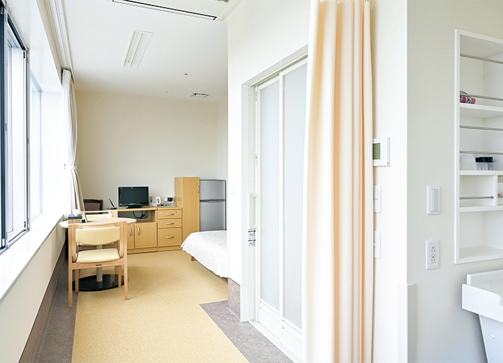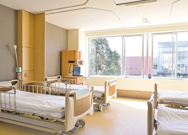 4床室は、ベットの間に視線を遮る袖壁を設けるなど、個別性の高い設計で患者さんのプライバシーに配慮しました。お隣の視線を気にすることなく、プライベートな空間でおくつろぎいただけます。