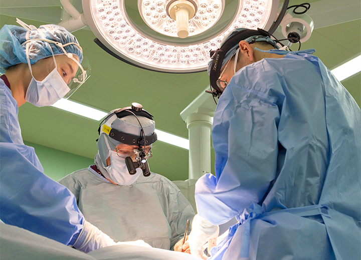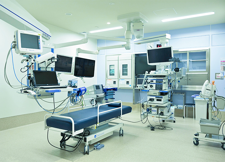カテーテルを使う内科的治療と外科手術の同時進行が可能なハイブリット手術室をはじめ、最新機器を完備した手術室を9室配置。また、術野映像を院内サーバーで一元管理するシステムを導入、3階講堂へのライブ配信が可能です。