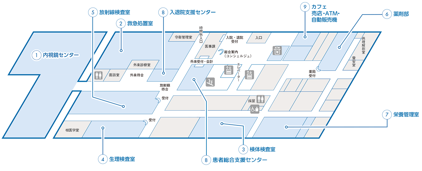 緊急性の高い高度医療にも迅速に対応できるよう、各フロアーごとに機能を集約し、導線を考えた効率的な配置となっています。
