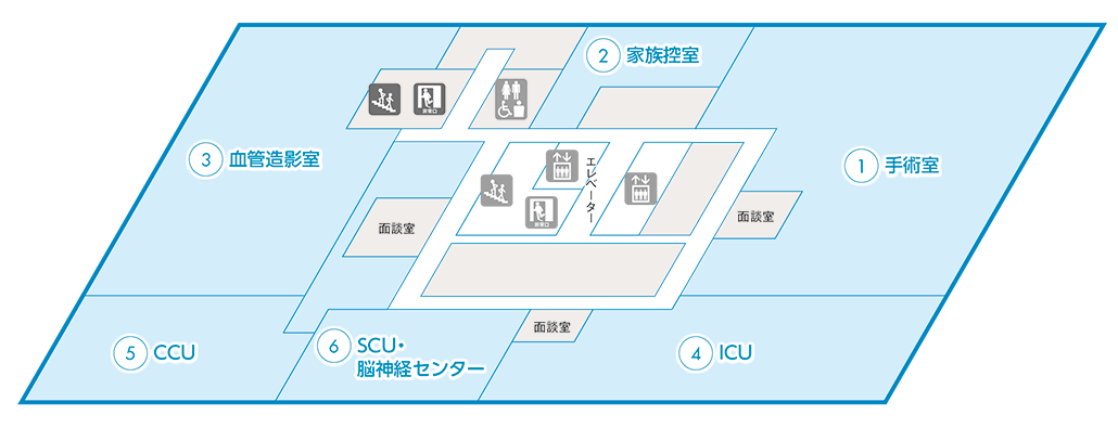 ICUとCCUに直結、手術室・血管造影室とも近接配置され、2020年より脳神経センターを設けたSCUでは、緊急時のよりスピーディな対応が可能になりました。救急入院の患者さんはもちろん、院内での重篤化にもいち早く対応、常に万全の体制で質の高いケアを提供します。