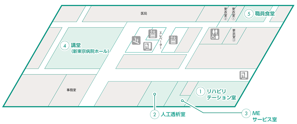 管理・事務系部門と人工透析室・リハビリ室を配した静かで落ち着きのあるフロアー