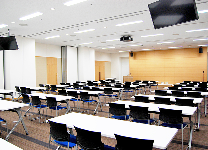 院内外の会議・イベントに利用可能な多目的スペースです。院内ネットワークを介し、手術中の術野映像や内視鏡画像がリアルタイムに視聴可能な映像システムを完備、TV会議システムを併用した質疑応答も可能です。