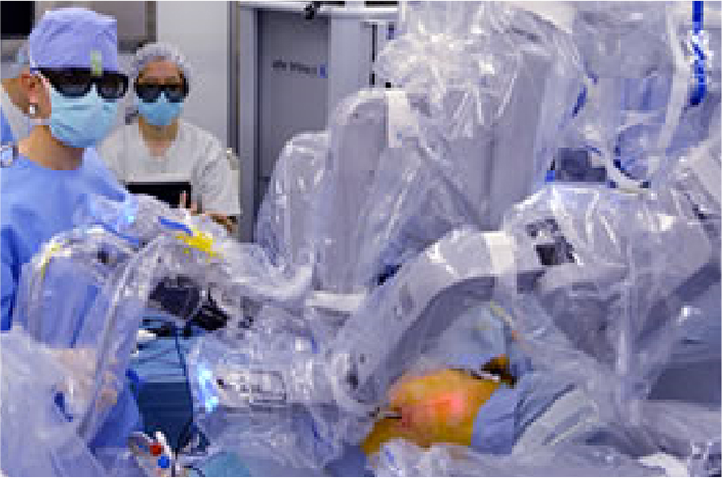 患者さんのお腹にあけた小さな穴に手術器具を取り付けたロボットアームと内視鏡を挿入し、医師がサージョンコンソールと呼ばれる操作ボックスの中で、内視鏡画像を見ながら操作して手術を行います。