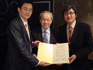 写真は台北での調印式の模様(左よりDr Kuan-Ming Chu、院長Dr Cho、Dr 中尾)