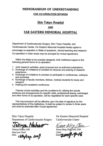 台湾の首都台北にあるFar Eastern Memorial Hospital心臓血管外科センターの部長Kuan-Ming Chiu先生とは親友であり、新東京病院心臓血管外科との間で2009年9月16日に両病院間での医療&学術研修相互協力関係の契約を結んだ。