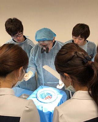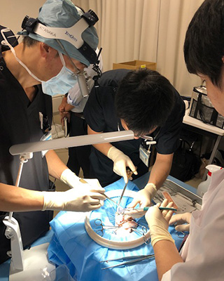 ラボでは、3人(中尾、北中、松山)のオペレーターとその他、心臓血管外科医師指導のもと、冠動脈バイパス術や僧帽弁置換術、大動脈弁置換術などを実際に体験しました。