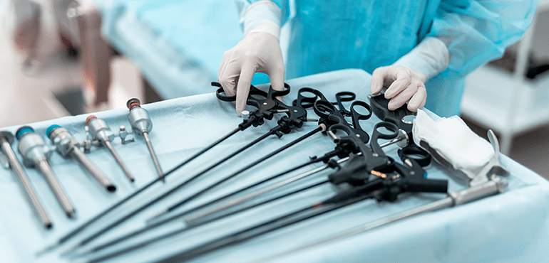 直線的で30cm以上の長さがある鉗子やはさみ、止血を行いながら切開が行える超音波凝固切開装置、腸管の縫合を行う自動縫合器などの腹腔鏡手術用の機器を使用します。