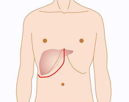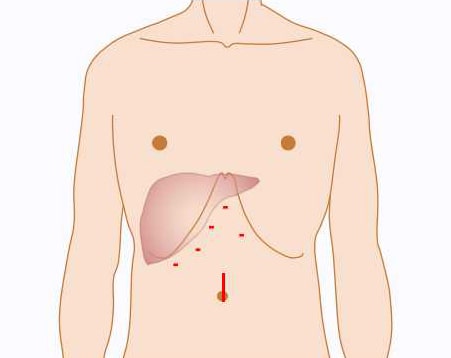肝臓は右の肋骨の奥深いところに納まっているため、開腹手術では体壁をかなり大きく切開する必要がありますが、腹腔鏡手術ではいくつかの小さな穴と肝臓を取り出すための最低限の切開ですみます。