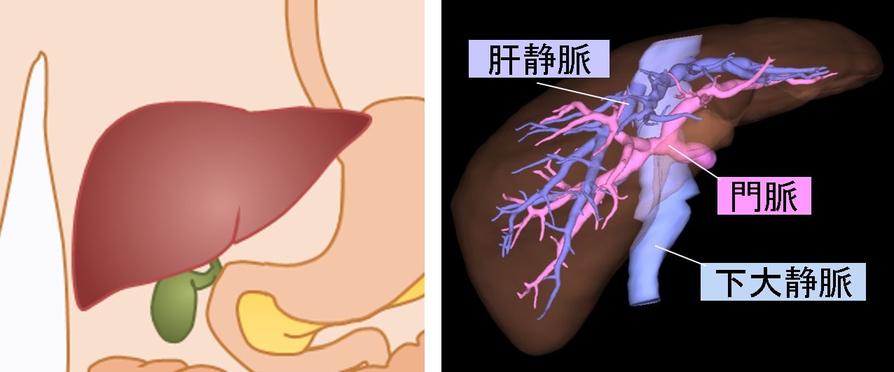 そのため、肝臓内には血液を流し込む血管と血液を運び出す血管が、2本の木が枝を重ねたように埋まっていて、その中を大量の血液が流れています。