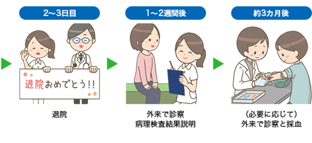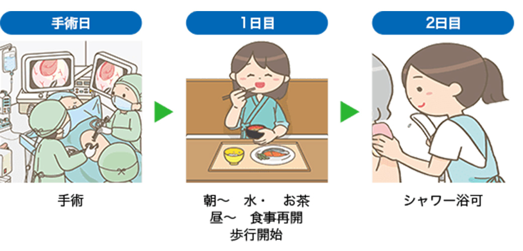 手術後、麻酔がさめて意識がおおよそ戻った状態で病室に帰ってきます。 麻酔は翌日の朝にはほぼ完全に覚めます。 麻酔を予定通りにさますことができた場合には、術翌日朝から水を飲み、昼から食事を始めます。 術後2日目からシャワー浴が可能になります。 術後2~3日目に退院となります。退院時の状況は、自宅で手術前と同じ様な食事をとって散歩や家事が可能な状態です。 通常は退院後1~2週間で重労働以外の仕事は可能になります。 それぞれの患者様方のもともとの状態にもよりますが、約1ヶ月後には手術前とほぼ同じくらいの体力に回復できる見込みです。