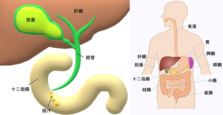胃や十二指腸に食物がなければ、胆汁は無駄にならないよう胆嚢内に貯留します。そして、胃内に食物がたまると胆嚢は収縮し、効率的に胆汁が流れる仕組みになっています。