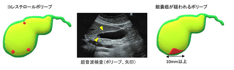 胆嚢内にできる良性腫瘍ですが、大きさが1cm以上の場合や増大傾向を認める場合には悪性(胆嚢癌)である可能性が若干高くなります。