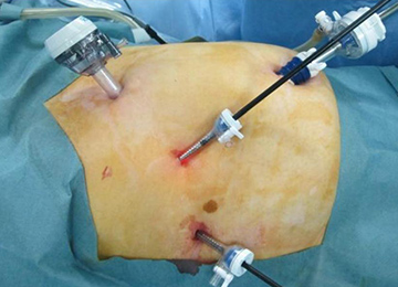 手術は全身麻酔下に行います。 はじめに臍に約1cmの小孔を開け、小開腹します。そこから炭酸ガスを送気し、お腹をドーム状に膨らませます。スコープを挿入し、内部を観察します。引き続き1cm大の穴を3ヶ所開け、そこからスコープや鉗子を挿入し、モニターを見ながら手術を行います。