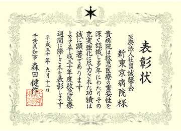 地域の救急医療に対する貢献を評価され、この度千葉県より表彰されました。引き続き、新東京病院スタッフ一丸となって、誠心誠意尽力して参りたいと存じます。