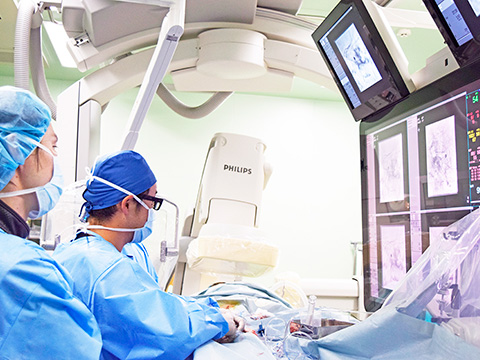- 脳血管外科医、脳血管内治療医(カテーテル医)、神経内科医、リハビリテーション医が力をあわせて治療にあたります。24時間365日最先端の医療を提供しています。