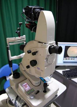眼の奥にある網膜にレーザーを照射することにより、病的な網膜を凝固させ進行を抑制したり治療を行う装置です。