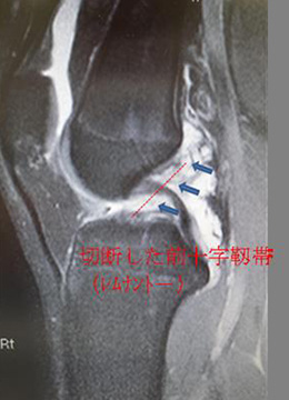 スポーツ外傷として頻度が高く、ジャンプ後の着地、疾走中の急激な停止、相手との衝突などで、膝関節に異常な回旋力が加わって損傷します。受傷時には「ブツッ」という断裂音や膝が外れた感じがして激しい痛みを伴ったり、徐々に膝が腫れて曲がりが悪くなりますが、急性期を過ぎると症状は無くなるため、“治った“と自己判断して病院への受診が遅れる場合もあります。損傷により靱帯に正常な緊張がなくなり緩みが生じると、関節の安定性が損なわれ、膝が容易にガクッと外れるような“膝崩れ”の症状が残ります。