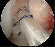 自分の組織を用いて再建する(自家腱移植)のがベストな方法とされています。当院で行っている膝屈筋腱(ハムストリングス)を用いた関節鏡視下膝前十字靱帯再建術は、切開は最小限で大きな合併症がなく、術後の成績も安定しているため、有効な治療方法として確立されています。 手術は膝関節を構成する大腿骨と脛骨の最適部位に関節鏡を用いて細いトンネルを作製し、そこに採取加工した腱を貫いて上端と下端を金具で固定することで膝の安定性を得ることを目的とし、全身麻酔+硬膜外持続麻酔下で行います。尚、本院では遺残靱帯(レムナント)が残存している患者様に対しては再生医療の観点※からレムナントを切除せずレムナントを利用し一重束前十字靱帯再建術(レムナント温存法)を、また女性で膝が柔らかい患者様(反張膝の患者様)などには二重束前十字靱帯再建術を、また二度目の受傷の患者様などには膝蓋腱を用いて一重束前十字靱帯再建術(BTB法)をおこなっています。また、縫合可能な半月板損傷がある患者様に対しては全例半月板縫合を行います。(Biomet MaxFire™ を利用し、関節内だけの操作で縫合します。)手術時間はレムナント温存法で行った時は約1時間から1時間半です。