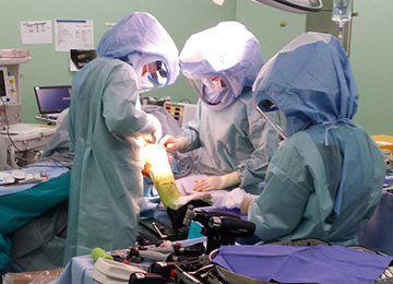 - 新東京病院バイオフリーの手術室(スーパークリーンルーム)で手術を行います。手術中はTotal Shield (Surgical-Helmet-System, Zimmer-Biomet社)、ジンマーデブリッドシステム(ジェット洗浄 Zimmer-Biomet社)を使用し人工関節のリスクである感染に十分注意し手術を行います。