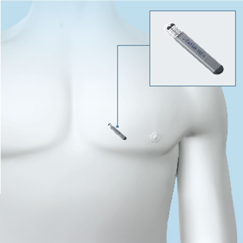 植込み型ループ式心電図(植込み型心臓モニター)は図の機器を含め3社から提供されています。症状出現時の心電図の記録が可能です。また、不整脈が出現したときに自動的に記録を行います。記録は体外より特殊な機器で読み取ります。また、ご自宅に中継機器を置くことでインターネットを通じ来院されなくても担当医が記録を確認することも可能です。
