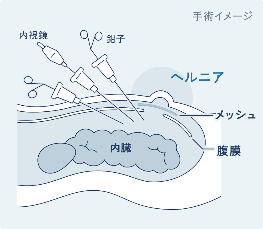 お腹に5mmの穴を3箇所開けて、カメラと器具を入れて行う手術です。腹腔内または腹膜の下からアプローチし、メッシュを広く当てて補強します。傷が小さく、痛みが少なく、回復が早いのが特徴です。