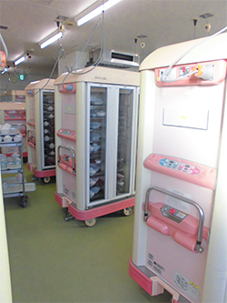 厨房で調理した食事は温冷配膳車で各病棟へ配膳され、温かいものは温かく、冷たいものは冷たく、患者様にとって一番良い状態で、お届けできるようにしています。