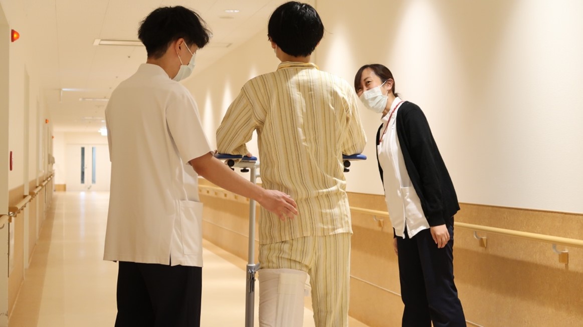 手術後は早期退院に向けて、手術翌日より体調を考慮した上で、機能訓練や基本的動作訓練を開始し、患者様の疼痛軽減・動作能力向上を目指しています。また、病棟での安全な移動手段を病棟スタッフと相談していく事で、リハビリテーションの時間以外での活動量向上を図り、早期退院に繋がるよう努めています。
