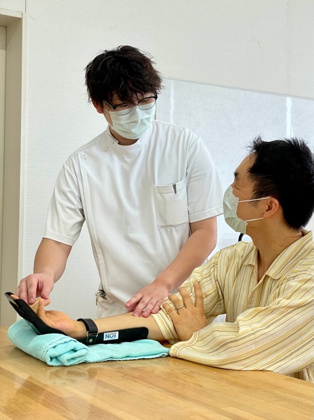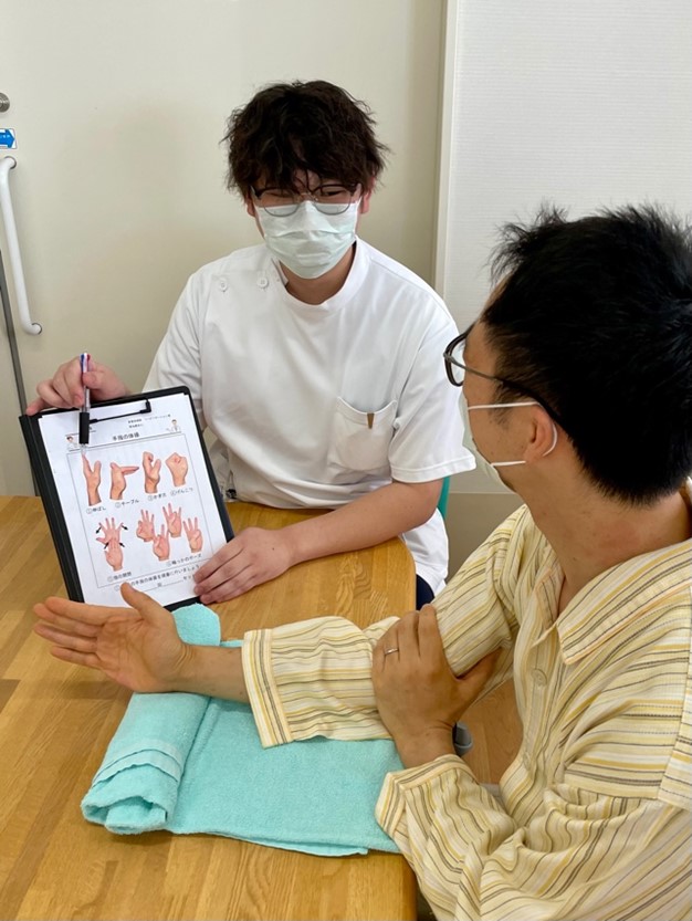 作業療法部門では、「Useful Hand(実際に生活する手)」の再獲得を目標とした入院期のハンドセラピィを行なっております。主な対象は、橈骨遠位端骨折や肘頭骨折といった上肢骨折、手指切断や腱断裂といった上肢外傷です。ハンドセラピィの安全性と良好な治療効果を得るために、整形外科・形成外科と定期的な症例検討会を行い、医師をはじめ多職種が連携して治療方針を検討しています。上肢骨折の場合は、手術後の入院日数が比較的短いため、退院後にも継続できる自主訓練をわかりやすくお伝えしています。必要に応じてクリニックでの外来リハビリテーションへ移行しています。