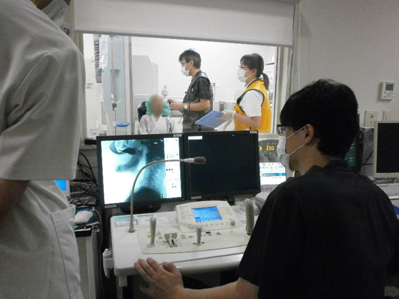 言語聴覚士(以下ST)は、言語・コミュニケーションの専門家です。また摂食・嚥下機能の問題にも専門的に取り組んでいます。「話しにくい」「呂律がまわらない」「飲み込みにくい」「食事でむせが増えた」「声が枯れてしまう」などに対してリハビリテーションを実施しています。各科の依頼を受け発症直後や手術後の早期から介入し、リスク管理のもと安全に実施しています。嚥下障害者に対しては、必要に応じて嚥下造影検査(VF)や嚥下内視鏡検査(VE)を行っています。看護部向けの勉強会や嚥下ワーキンググループを通して他職種と連携した患者支援にも積極的に取り組んでいます。