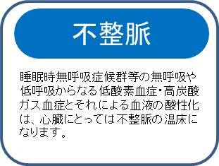 睡眠時無呼吸症候群等の無呼吸や低呼吸による低酸素血症、高炭酸ガス血症とそれによる血液の酸性化は、以下、種々の病気(生活習慣病等)と関連することも知られているため、注意が必要です。