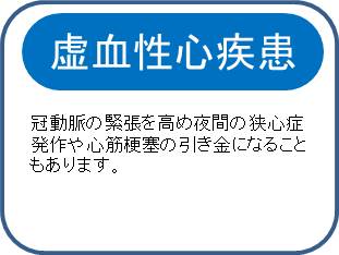 さらに、血液中の酸素の低下と炭酸ガスの蓄積や血液の酸性化をもたらし、長期的に様々な臓器に悪影響を及ぼすこともあります。