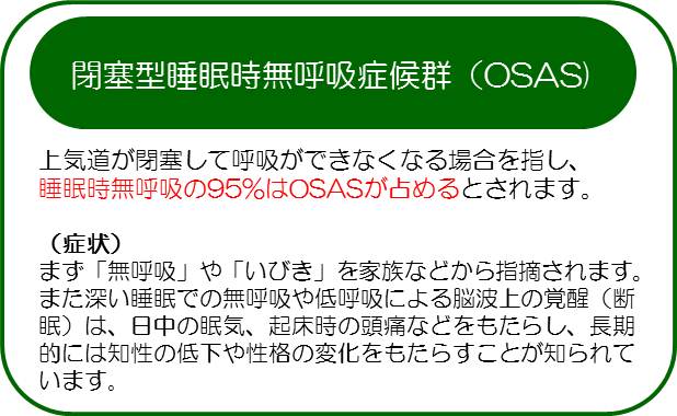 - 10秒間以上続く無呼吸が、一晩の睡眠中(7時間)に30回以上もしくは1時間に平均5回以上認められる